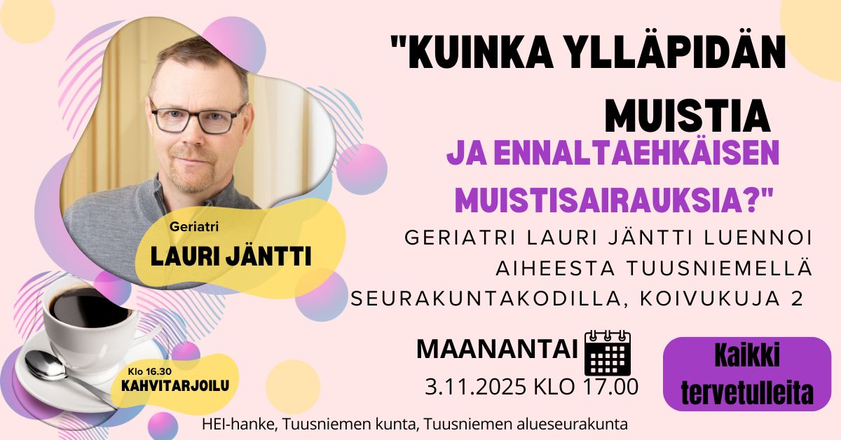 ma 3.11. klo 16.30 alkaa kahvitarjoilulla. Geriatri Lauri Jäntti luennoi muistista. Seurakuntakodilla, Koivukuja 2.