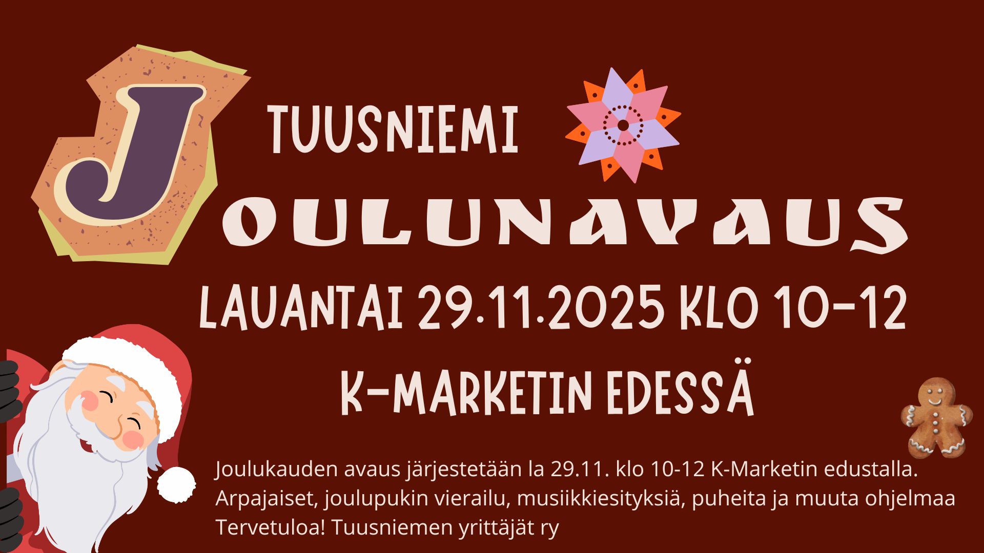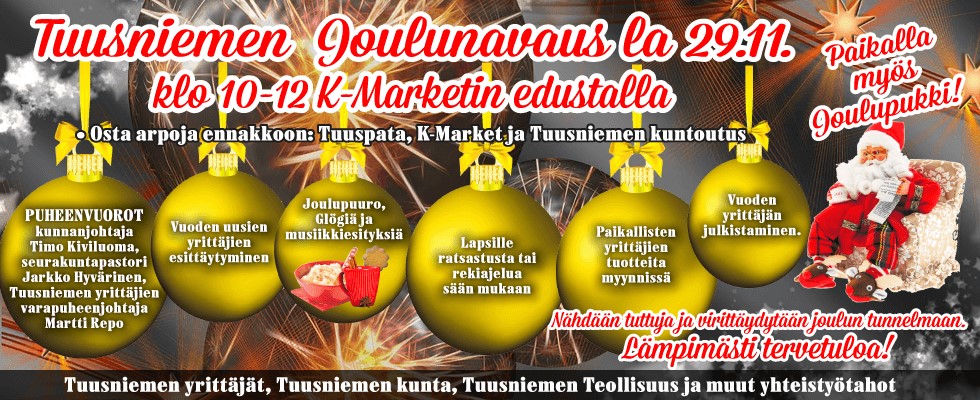 la 29.11. Joulukauden avaus, Tuusniemen yrittäjät. K-Marketin edustalla. Ohjelmassa arpajaiset, joulupukin vierailu, musiikkiesityksiä, puheita