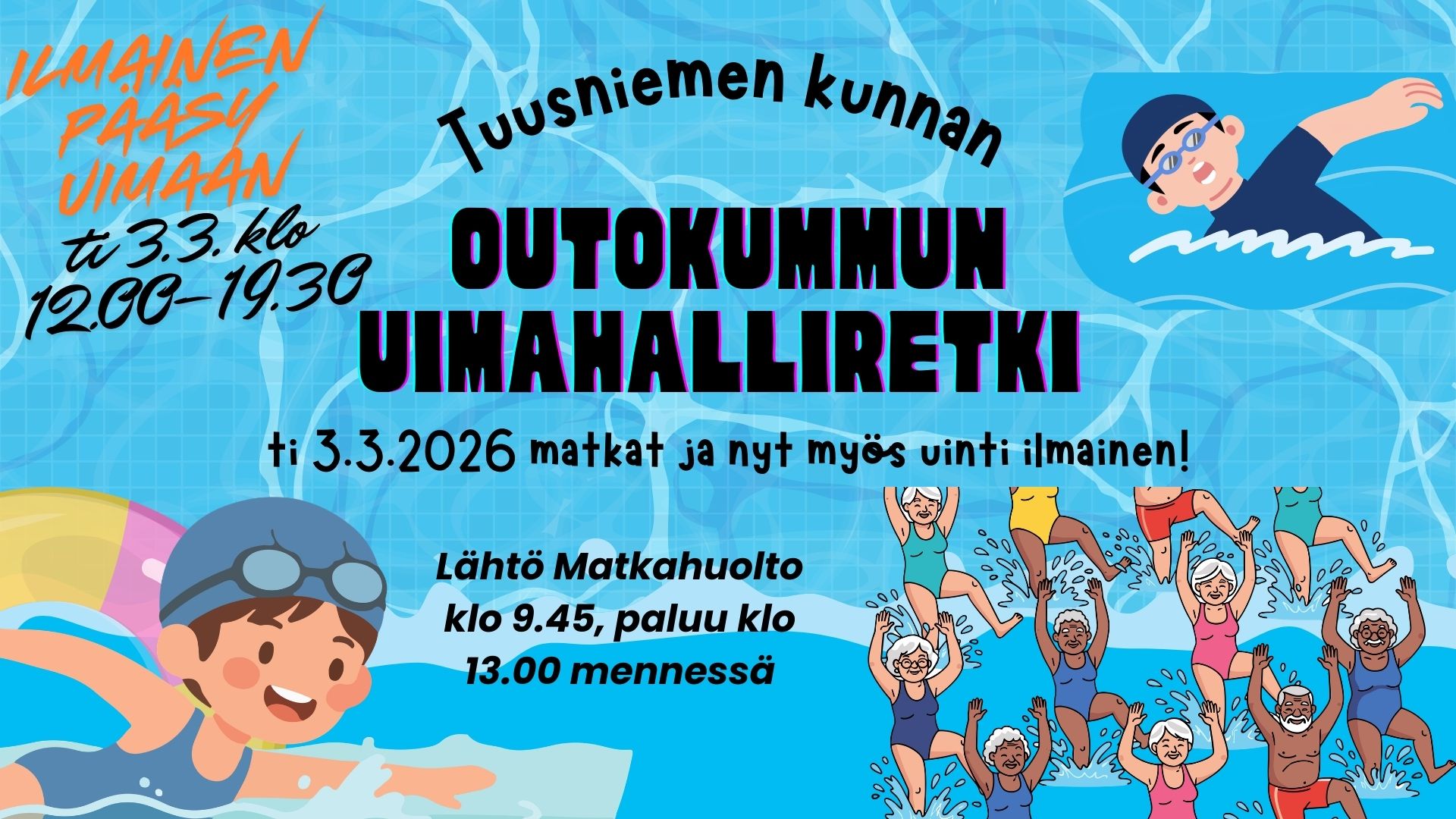 Uimala täyttyy tekemisestä ja ohjelmasta kouluun paluun kunniaksi. DJ, itämaista tanssia, Pellehyppelyä, hiekkalinnakisa, Karaokemimmit, Kepparirata, Suppailua, Aarteen etsintää, Rantalentistä, Tikkaturnaus, Pomppulinnoja, Kahvio, Makkaraa, Lettuja, Arpajaiset, Makaronisalaattia, … Järjestää Koillis-Savon 4H, Tuusniemen Raju, Tuustaiteiset, Kaavin nuorisovaltuusto, Tuusniemen nuorisovaltuusto, Tuusniemen kylät, Seleviytymishanke, Tuusniemen kunnan vapaa-aikatoimi. Tuusniemen uimala, Anaskintie 38.
