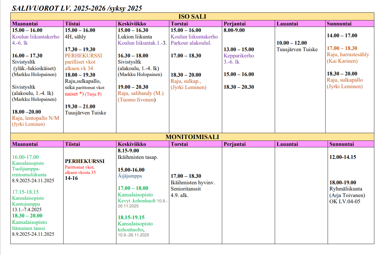 Liikuntasalin viikottaiset ryhmät, talvikausi 2025-2026