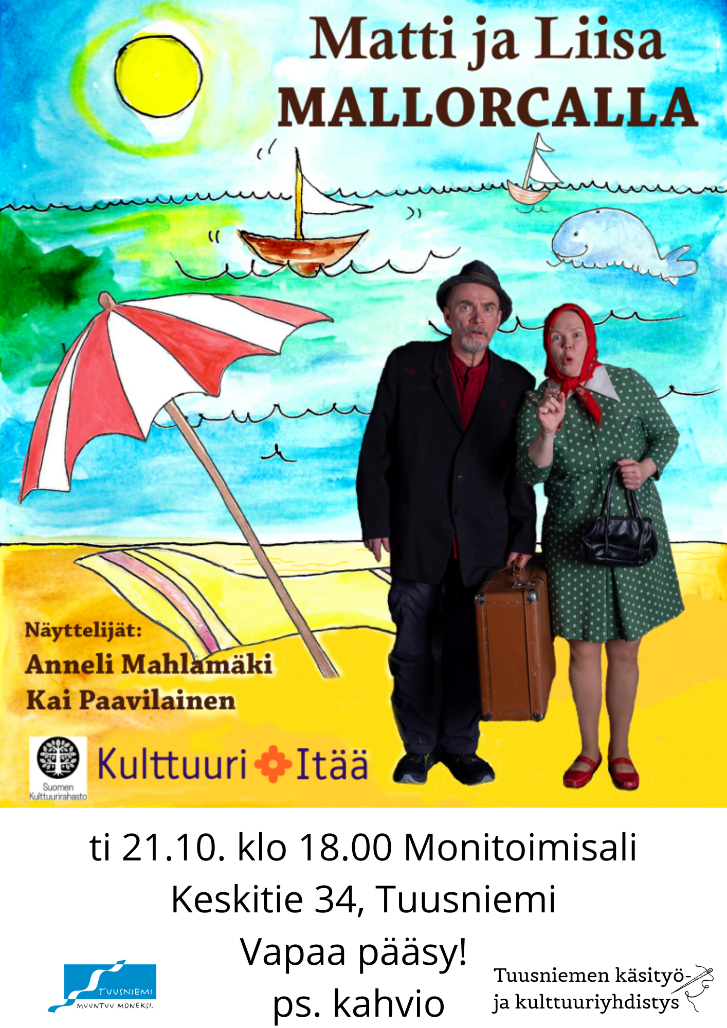 ti 21.10. kello 18.00 Matti ja Liisa Mallorcalla Kiertue-esitys, vapaapääsy. Kahvio. Tuusniemen käsityö- ja kulttuuriyhdistys, Kulttuuri Itää, vapaa-aikatoimi. Monitoimisali, Keskitie 34 Tuusniemi