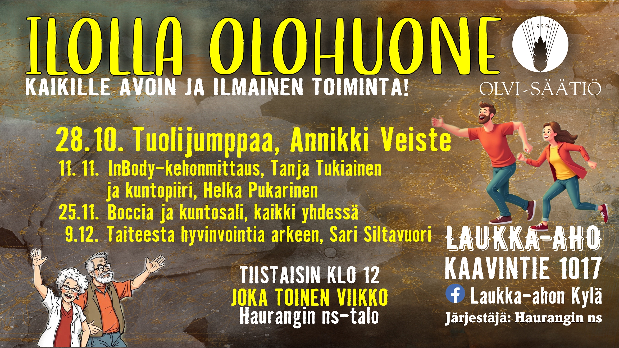 ti 11.11. klo 12. Ilolla olohuone. Haurangin nuorisoseuran talo, Kaavintie 1017, Laukka-aho.