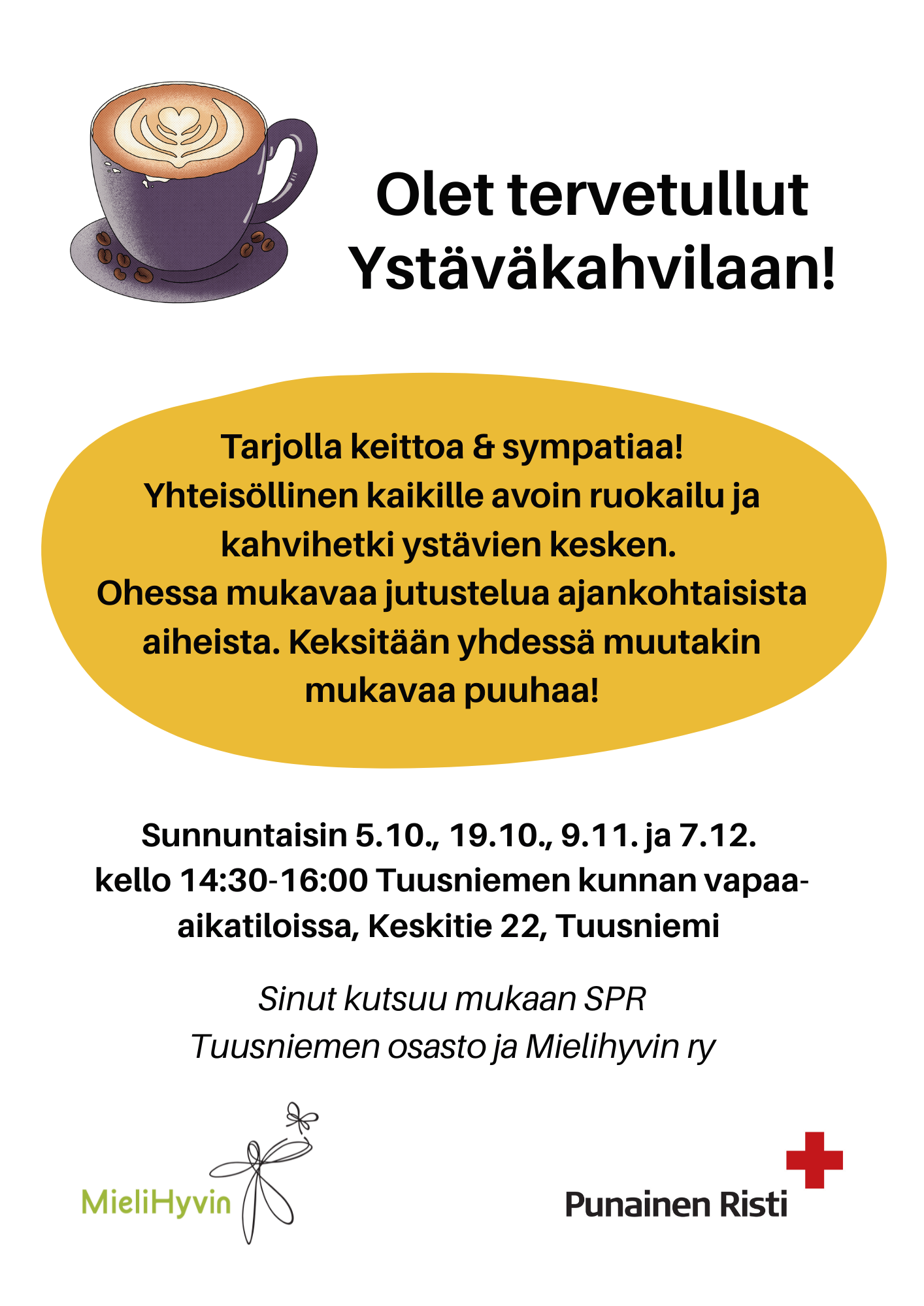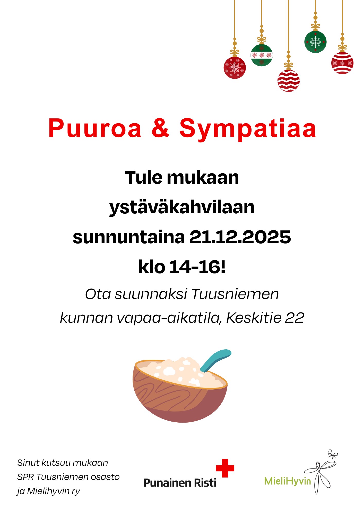su 21.12. klo 14-16. SPR:n ystäväkahvila. Puuroa & sympatiaa. Nuoriso- ja järjestötila, Keskitie 22.